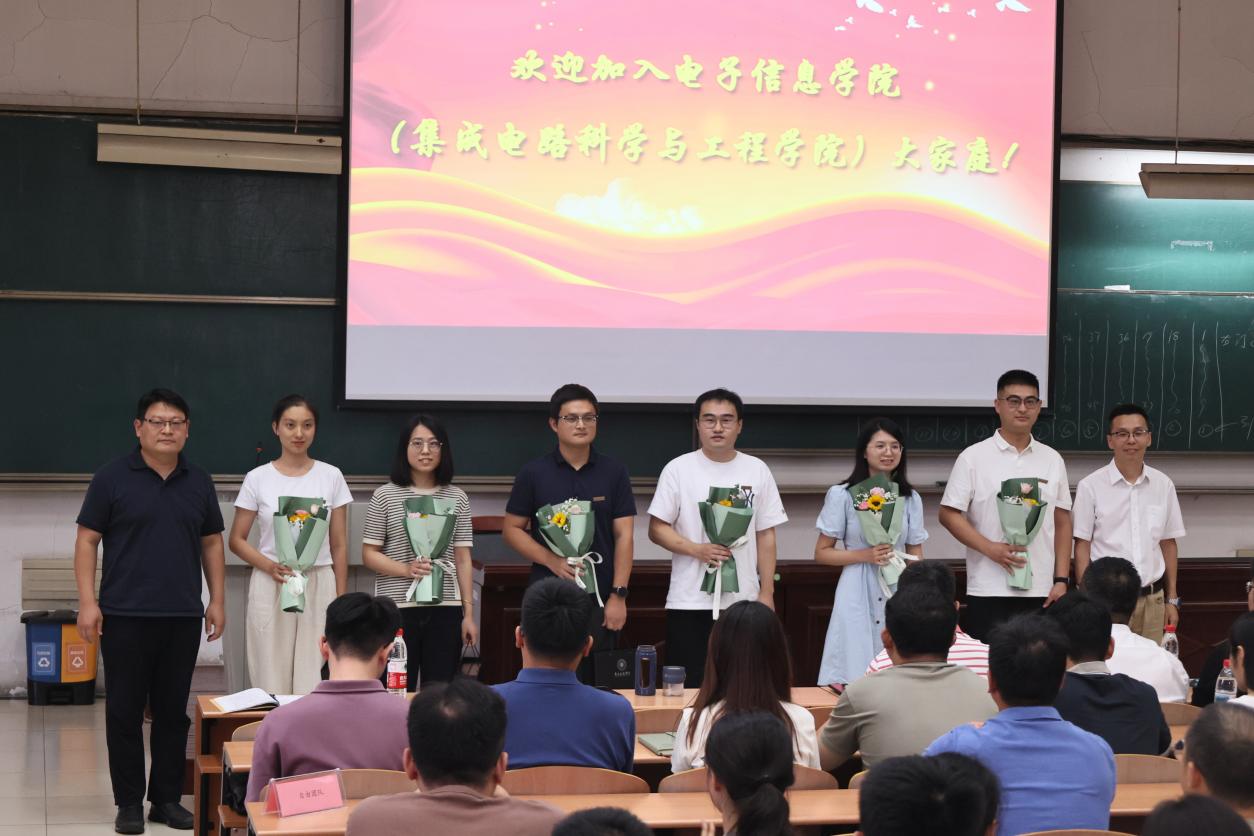 会上为近半年来新入职的教师举办了欢迎仪式,陈龙、何志伟对新入职教师献上鲜花、送出纪念礼物,希望新入职教师更快更好的融入学院,感受到电子信息学院大家庭的温暖。