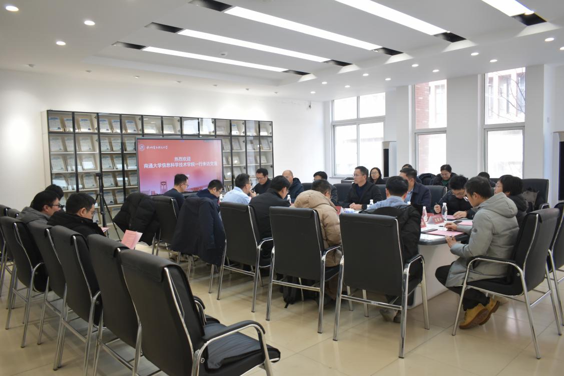 为深化校际合作交流,1月23日,南通大学信息科学技术学院党委副书记、院长杨永杰,党委书记周平带队,学院领导班子成员、系部负责人及骨干教师代表一行到访我院,双方开展深入交流座谈。我院院长何志伟、党委书记陈龙,党委副书记、纪委书记章宗森,副院长赵文生及教师代表参会。